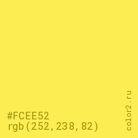 Цвет #FCEE52 в цветовой модели RGB обозначается тремя октетами (252, 238, 82) в десятичном формате и #FCEE52 в шестнадцатиричном (hex) формате, которые являются интенсивностью красного 252 (hex FC), интенсивность зелёного 238 (hex EE) и интенсивность синего 82 (hex 52).