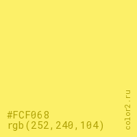 Цвет #FCF068 в цветовой модели RGB обозначается тремя октетами (252, 240, 104) в десятичном формате и #FCF068 в шестнадцатиричном (hex) формате, которые являются интенсивностью красного 252 (hex FC), интенсивность зелёного 240 (hex F0) и интенсивность синего 104 (hex 68).