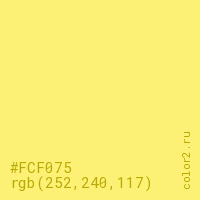 Цвет #FCF075 в цветовой модели RGB обозначается тремя октетами (252, 240, 117) в десятичном формате и #FCF075 в шестнадцатиричном (hex) формате, которые являются интенсивностью красного 252 (hex FC), интенсивность зелёного 240 (hex F0) и интенсивность синего 117 (hex 75).