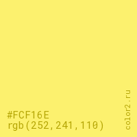 Цвет #FCF16E в цветовой модели RGB обозначается тремя октетами (252, 241, 110) в десятичном формате и #FCF16E в шестнадцатиричном (hex) формате, которые являются интенсивностью красного 252 (hex FC), интенсивность зелёного 241 (hex F1) и интенсивность синего 110 (hex 6E).