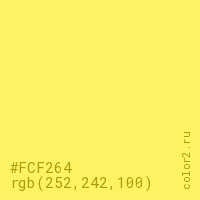 Цвет #FCF264 в цветовой модели RGB обозначается тремя октетами (252, 242, 100) в десятичном формате и #FCF264 в шестнадцатиричном (hex) формате, которые являются интенсивностью красного 252 (hex FC), интенсивность зелёного 242 (hex F2) и интенсивность синего 100 (hex 64).