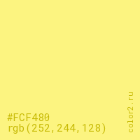 Цвет #FCF480 в цветовой модели RGB обозначается тремя октетами (252, 244, 128) в десятичном формате и #FCF480 в шестнадцатиричном (hex) формате, которые являются интенсивностью красного 252 (hex FC), интенсивность зелёного 244 (hex F4) и интенсивность синего 128 (hex 80).
