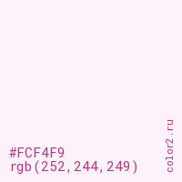 Цвет #FCF4F9 в цветовой модели RGB обозначается тремя октетами (252, 244, 249) в десятичном формате и #FCF4F9 в шестнадцатиричном (hex) формате, которые являются интенсивностью красного 252 (hex FC), интенсивность зелёного 244 (hex F4) и интенсивность синего 249 (hex F9).