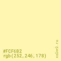 Цвет #FCF6B2 в цветовой модели RGB обозначается тремя октетами (252, 246, 178) в десятичном формате и #FCF6B2 в шестнадцатиричном (hex) формате, которые являются интенсивностью красного 252 (hex FC), интенсивность зелёного 246 (hex F6) и интенсивность синего 178 (hex B2).