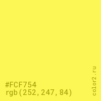 Цвет #FCF754 в цветовой модели RGB обозначается тремя октетами (252, 247, 84) в десятичном формате и #FCF754 в шестнадцатиричном (hex) формате, которые являются интенсивностью красного 252 (hex FC), интенсивность зелёного 247 (hex F7) и интенсивность синего 84 (hex 54).