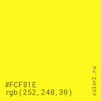 Цвет #FCF81E в цветовой модели RGB обозначается тремя октетами (252, 248, 30) в десятичном формате и #FCF81E в шестнадцатиричном (hex) формате, которые являются интенсивностью красного 252 (hex FC), интенсивность зелёного 248 (hex F8) и интенсивность синего 30 (hex 1E).