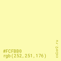 Цвет #FCFBB0 в цветовой модели RGB обозначается тремя октетами (252, 251, 176) в десятичном формате и #FCFBB0 в шестнадцатиричном (hex) формате, которые являются интенсивностью красного 252 (hex FC), интенсивность зелёного 251 (hex FB) и интенсивность синего 176 (hex B0).