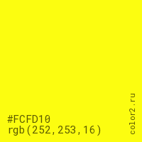 Цвет #FCFD10 в цветовой модели RGB обозначается тремя октетами (252, 253, 16) в десятичном формате и #FCFD10 в шестнадцатиричном (hex) формате, которые являются интенсивностью красного 252 (hex FC), интенсивность зелёного 253 (hex FD) и интенсивность синего 16 (hex 10).
