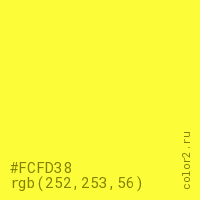 Цвет #FCFD38 в цветовой модели RGB обозначается тремя октетами (252, 253, 56) в десятичном формате и #FCFD38 в шестнадцатиричном (hex) формате, которые являются интенсивностью красного 252 (hex FC), интенсивность зелёного 253 (hex FD) и интенсивность синего 56 (hex 38).