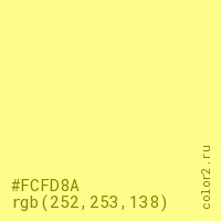 Цвет #FCFD8A в цветовой модели RGB обозначается тремя октетами (252, 253, 138) в десятичном формате и #FCFD8A в шестнадцатиричном (hex) формате, которые являются интенсивностью красного 252 (hex FC), интенсивность зелёного 253 (hex FD) и интенсивность синего 138 (hex 8A).