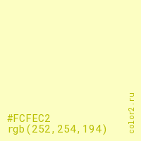 Цвет #FCFEC2 в цветовой модели RGB обозначается тремя октетами (252, 254, 194) в десятичном формате и #FCFEC2 в шестнадцатиричном (hex) формате, которые являются интенсивностью красного 252 (hex FC), интенсивность зелёного 254 (hex FE) и интенсивность синего 194 (hex C2).