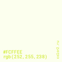 Цвет #FCFFEE в цветовой модели RGB обозначается тремя октетами (252, 255, 238) в десятичном формате и #FCFFEE в шестнадцатиричном (hex) формате, которые являются интенсивностью красного 252 (hex FC), интенсивность зелёного 255 (hex FF) и интенсивность синего 238 (hex EE).