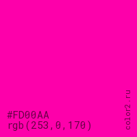 Цвет #FD00AA в цветовой модели RGB обозначается тремя октетами (253, 0, 170) в десятичном формате и #FD00AA в шестнадцатиричном (hex) формате, которые являются интенсивностью красного 253 (hex FD), интенсивность зелёного 0 (hex 00) и интенсивность синего 170 (hex AA).