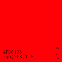 Цвет #FD0106 в цветовой модели RGB обозначается тремя октетами (253, 1, 6) в десятичном формате и #FD0106 в шестнадцатиричном (hex) формате, которые являются интенсивностью красного 253 (hex FD), интенсивность зелёного 1 (hex 01) и интенсивность синего 6 (hex 06).
