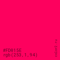 Цвет #FD015E в цветовой модели RGB обозначается тремя октетами (253, 1, 94) в десятичном формате и #FD015E в шестнадцатиричном (hex) формате, которые являются интенсивностью красного 253 (hex FD), интенсивность зелёного 1 (hex 01) и интенсивность синего 94 (hex 5E).