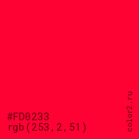 Цвет #FD0233 в цветовой модели RGB обозначается тремя октетами (253, 2, 51) в десятичном формате и #FD0233 в шестнадцатиричном (hex) формате, которые являются интенсивностью красного 253 (hex FD), интенсивность зелёного 2 (hex 02) и интенсивность синего 51 (hex 33).