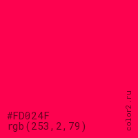 Цвет #FD024F в цветовой модели RGB обозначается тремя октетами (253, 2, 79) в десятичном формате и #FD024F в шестнадцатиричном (hex) формате, которые являются интенсивностью красного 253 (hex FD), интенсивность зелёного 2 (hex 02) и интенсивность синего 79 (hex 4F).