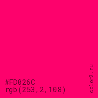 Цвет #FD026C в цветовой модели RGB обозначается тремя октетами (253, 2, 108) в десятичном формате и #FD026C в шестнадцатиричном (hex) формате, которые являются интенсивностью красного 253 (hex FD), интенсивность зелёного 2 (hex 02) и интенсивность синего 108 (hex 6C).