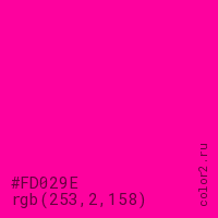 Цвет #FD029E в цветовой модели RGB обозначается тремя октетами (253, 2, 158) в десятичном формате и #FD029E в шестнадцатиричном (hex) формате, которые являются интенсивностью красного 253 (hex FD), интенсивность зелёного 2 (hex 02) и интенсивность синего 158 (hex 9E).