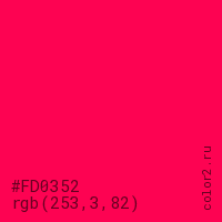 Цвет #FD0352 в цветовой модели RGB обозначается тремя октетами (253, 3, 82) в десятичном формате и #FD0352 в шестнадцатиричном (hex) формате, которые являются интенсивностью красного 253 (hex FD), интенсивность зелёного 3 (hex 03) и интенсивность синего 82 (hex 52).