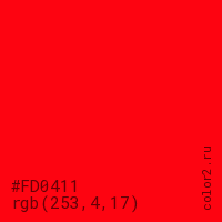 Цвет #FD0411 в цветовой модели RGB обозначается тремя октетами (253, 4, 17) в десятичном формате и #FD0411 в шестнадцатиричном (hex) формате, которые являются интенсивностью красного 253 (hex FD), интенсивность зелёного 4 (hex 04) и интенсивность синего 17 (hex 11).