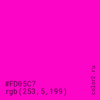 Цвет #FD05C7 в цветовой модели RGB обозначается тремя октетами (253, 5, 199) в десятичном формате и #FD05C7 в шестнадцатиричном (hex) формате, которые являются интенсивностью красного 253 (hex FD), интенсивность зелёного 5 (hex 05) и интенсивность синего 199 (hex C7).