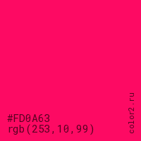 Цвет #FD0A63 в цветовой модели RGB обозначается тремя октетами (253, 10, 99) в десятичном формате и #FD0A63 в шестнадцатиричном (hex) формате, которые являются интенсивностью красного 253 (hex FD), интенсивность зелёного 10 (hex 0A) и интенсивность синего 99 (hex 63).