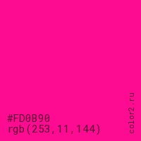 Цвет #FD0B90 в цветовой модели RGB обозначается тремя октетами (253, 11, 144) в десятичном формате и #FD0B90 в шестнадцатиричном (hex) формате, которые являются интенсивностью красного 253 (hex FD), интенсивность зелёного 11 (hex 0B) и интенсивность синего 144 (hex 90).