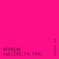 Цвет #FD0E86 в цветовой модели RGB обозначается тремя октетами (253, 14, 134) в десятичном формате и #FD0E86 в шестнадцатиричном (hex) формате, которые являются интенсивностью красного 253 (hex FD), интенсивность зелёного 14 (hex 0E) и интенсивность синего 134 (hex 86).