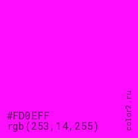 Цвет #FD0EFF в цветовой модели RGB обозначается тремя октетами (253, 14, 255) в десятичном формате и #FD0EFF в шестнадцатиричном (hex) формате, которые являются интенсивностью красного 253 (hex FD), интенсивность зелёного 14 (hex 0E) и интенсивность синего 255 (hex FF).
