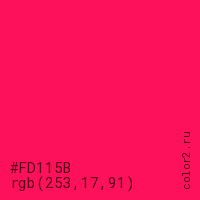 Цвет #FD115B в цветовой модели RGB обозначается тремя октетами (253, 17, 91) в десятичном формате и #FD115B в шестнадцатиричном (hex) формате, которые являются интенсивностью красного 253 (hex FD), интенсивность зелёного 17 (hex 11) и интенсивность синего 91 (hex 5B).