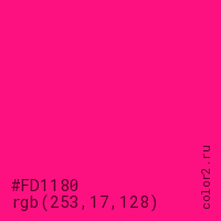 Цвет #FD1180 в цветовой модели RGB обозначается тремя октетами (253, 17, 128) в десятичном формате и #FD1180 в шестнадцатиричном (hex) формате, которые являются интенсивностью красного 253 (hex FD), интенсивность зелёного 17 (hex 11) и интенсивность синего 128 (hex 80).