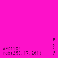 Цвет #FD11C9 в цветовой модели RGB обозначается тремя октетами (253, 17, 201) в десятичном формате и #FD11C9 в шестнадцатиричном (hex) формате, которые являются интенсивностью красного 253 (hex FD), интенсивность зелёного 17 (hex 11) и интенсивность синего 201 (hex C9).