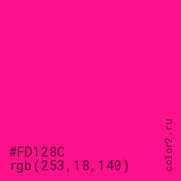 Цвет #FD128C в цветовой модели RGB обозначается тремя октетами (253, 18, 140) в десятичном формате и #FD128C в шестнадцатиричном (hex) формате, которые являются интенсивностью красного 253 (hex FD), интенсивность зелёного 18 (hex 12) и интенсивность синего 140 (hex 8C).
