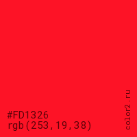 Цвет #FD1326 в цветовой модели RGB обозначается тремя октетами (253, 19, 38) в десятичном формате и #FD1326 в шестнадцатиричном (hex) формате, которые являются интенсивностью красного 253 (hex FD), интенсивность зелёного 19 (hex 13) и интенсивность синего 38 (hex 26).