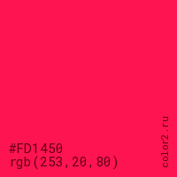 Цвет #FD1450 в цветовой модели RGB обозначается тремя октетами (253, 20, 80) в десятичном формате и #FD1450 в шестнадцатиричном (hex) формате, которые являются интенсивностью красного 253 (hex FD), интенсивность зелёного 20 (hex 14) и интенсивность синего 80 (hex 50).