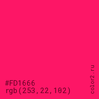 Цвет #FD1666 в цветовой модели RGB обозначается тремя октетами (253, 22, 102) в десятичном формате и #FD1666 в шестнадцатиричном (hex) формате, которые являются интенсивностью красного 253 (hex FD), интенсивность зелёного 22 (hex 16) и интенсивность синего 102 (hex 66).
