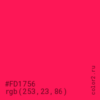 Цвет #FD1756 в цветовой модели RGB обозначается тремя октетами (253, 23, 86) в десятичном формате и #FD1756 в шестнадцатиричном (hex) формате, которые являются интенсивностью красного 253 (hex FD), интенсивность зелёного 23 (hex 17) и интенсивность синего 86 (hex 56).