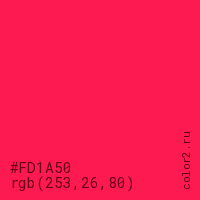 Цвет #FD1A50 в цветовой модели RGB обозначается тремя октетами (253, 26, 80) в десятичном формате и #FD1A50 в шестнадцатиричном (hex) формате, которые являются интенсивностью красного 253 (hex FD), интенсивность зелёного 26 (hex 1A) и интенсивность синего 80 (hex 50).