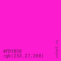 Цвет #FD1BD0 в цветовой модели RGB обозначается тремя октетами (253, 27, 208) в десятичном формате и #FD1BD0 в шестнадцатиричном (hex) формате, которые являются интенсивностью красного 253 (hex FD), интенсивность зелёного 27 (hex 1B) и интенсивность синего 208 (hex D0).