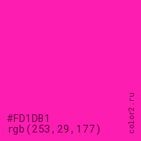Цвет #FD1DB1 в цветовой модели RGB обозначается тремя октетами (253, 29, 177) в десятичном формате и #FD1DB1 в шестнадцатиричном (hex) формате, которые являются интенсивностью красного 253 (hex FD), интенсивность зелёного 29 (hex 1D) и интенсивность синего 177 (hex B1).