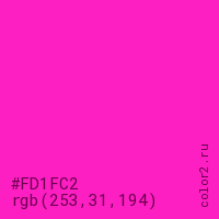Цвет #FD1FC2 в цветовой модели RGB обозначается тремя октетами (253, 31, 194) в десятичном формате и #FD1FC2 в шестнадцатиричном (hex) формате, которые являются интенсивностью красного 253 (hex FD), интенсивность зелёного 31 (hex 1F) и интенсивность синего 194 (hex C2).