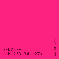 Цвет #FD227F в цветовой модели RGB обозначается тремя октетами (253, 34, 127) в десятичном формате и #FD227F в шестнадцатиричном (hex) формате, которые являются интенсивностью красного 253 (hex FD), интенсивность зелёного 34 (hex 22) и интенсивность синего 127 (hex 7F).
