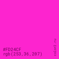Цвет #FD24CF в цветовой модели RGB обозначается тремя октетами (253, 36, 207) в десятичном формате и #FD24CF в шестнадцатиричном (hex) формате, которые являются интенсивностью красного 253 (hex FD), интенсивность зелёного 36 (hex 24) и интенсивность синего 207 (hex CF).