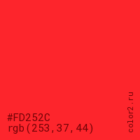 Цвет #FD252C в цветовой модели RGB обозначается тремя октетами (253, 37, 44) в десятичном формате и #FD252C в шестнадцатиричном (hex) формате, которые являются интенсивностью красного 253 (hex FD), интенсивность зелёного 37 (hex 25) и интенсивность синего 44 (hex 2C).