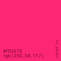 Цвет #FD2675 в цветовой модели RGB обозначается тремя октетами (253, 38, 117) в десятичном формате и #FD2675 в шестнадцатиричном (hex) формате, которые являются интенсивностью красного 253 (hex FD), интенсивность зелёного 38 (hex 26) и интенсивность синего 117 (hex 75).