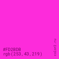 Цвет #FD2BDB в цветовой модели RGB обозначается тремя октетами (253, 43, 219) в десятичном формате и #FD2BDB в шестнадцатиричном (hex) формате, которые являются интенсивностью красного 253 (hex FD), интенсивность зелёного 43 (hex 2B) и интенсивность синего 219 (hex DB).