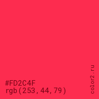 Цвет #FD2C4F в цветовой модели RGB обозначается тремя октетами (253, 44, 79) в десятичном формате и #FD2C4F в шестнадцатиричном (hex) формате, которые являются интенсивностью красного 253 (hex FD), интенсивность зелёного 44 (hex 2C) и интенсивность синего 79 (hex 4F).
