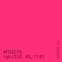 Цвет #FD2D76 в цветовой модели RGB обозначается тремя октетами (253, 45, 118) в десятичном формате и #FD2D76 в шестнадцатиричном (hex) формате, которые являются интенсивностью красного 253 (hex FD), интенсивность зелёного 45 (hex 2D) и интенсивность синего 118 (hex 76).