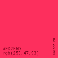 Цвет #FD2F5D в цветовой модели RGB обозначается тремя октетами (253, 47, 93) в десятичном формате и #FD2F5D в шестнадцатиричном (hex) формате, которые являются интенсивностью красного 253 (hex FD), интенсивность зелёного 47 (hex 2F) и интенсивность синего 93 (hex 5D).